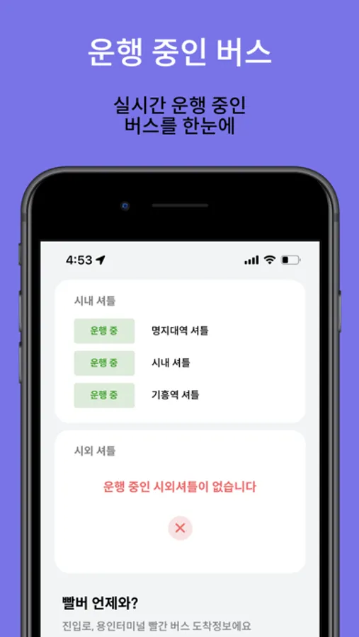 - 버스 운행 정보 확인, 빨간 버스 도착 정보 확인 등 홈화면에서 바로 확인 가능합니다