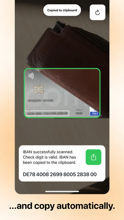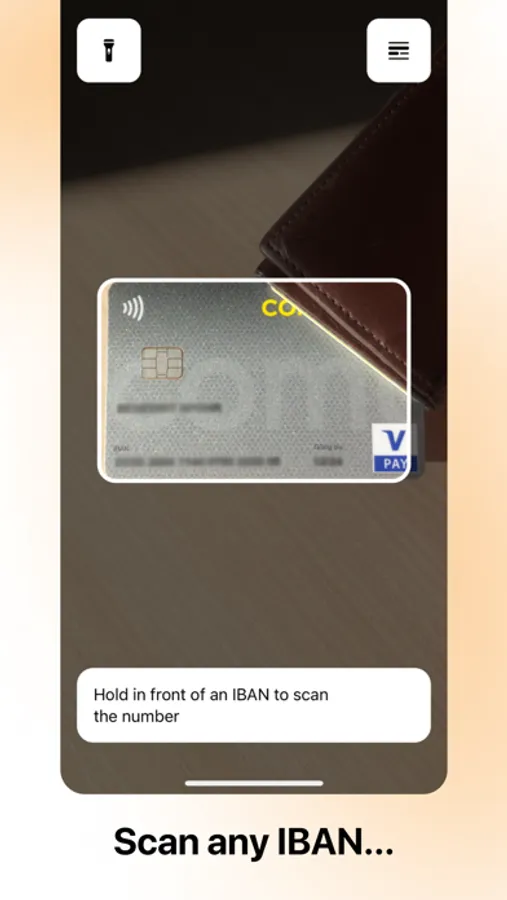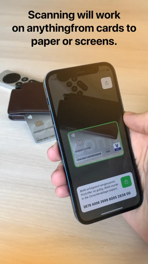 The scanner can be used to scan IBANs on cards, documents and screens and copy them to paste anywhere else.