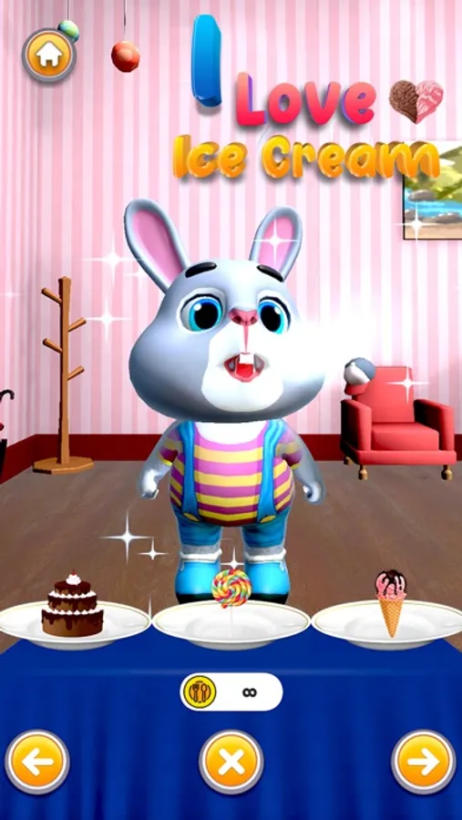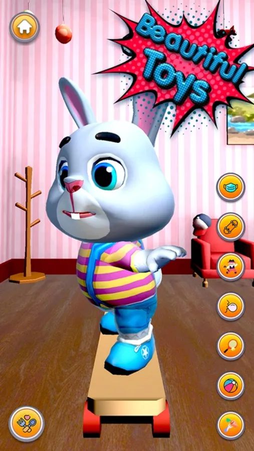 The Talking Rabbit Game is an interactive children's game. The game features a friendly talking bunny who guides the player through a series of fun and challenging activities, Get your virtual Rabbit who repeats everything you say with a funny voice. Enjoy hours of fun and laughter with bunny talking and give him all your love.