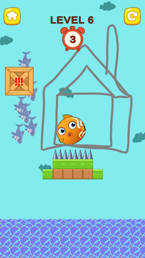 Think of intelligent ways to save the fish , draw your defense line, it can be a single line, a square, a circle, a house or even a big shelter. Your imagination will determine how you can save the fish from shark attacks.