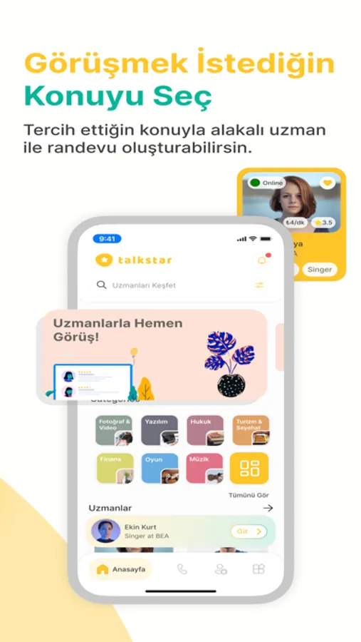 Talkstar'da, ilgilendiğiniz kategorilerde uzmanları görebilir ve size katkı sağlayacak uzmanları kolayca keşfedebilirsiniz. Ünlüve etkili kişileri görebilir ve onlarla görüşmek için kolayca randevu oluşturabilirsiniz. Sağlıklı yaşamdan astrolojiye, psikolojik terapiden diyete, iş ve kariyer konularından teknolojiye aradığınız bir çok konuda uzmanla hemen görüşmeye başlayabilirsiniz. Bir uzmana karar verdiğinizde, farklı uzunluktaki görüşme seçeneklerinden uygun gördüğünüzü seçin ve randevu alın. Görüntülü arama zamanı geldiğinde Talkstar uygulamasını açın ve görüşmenizi başlatın. Hepsi bu kadar kolay!