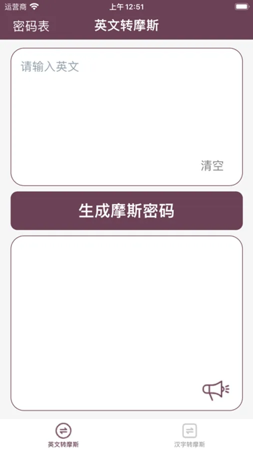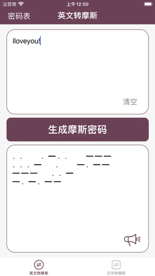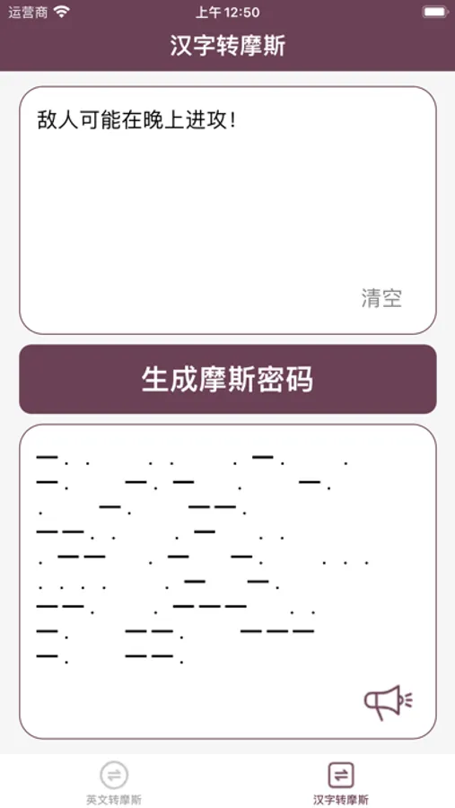 在英文字母输入区域输入英文字母,单击生成摩斯密码,将英文翻译为摩斯密码。在汉字输入区域输入汉字,单击生成摩斯密码,即可以将汉字转换为摩斯密码。使用该工具,可以实现摩斯密码的实时转换,传递你的神秘信息。