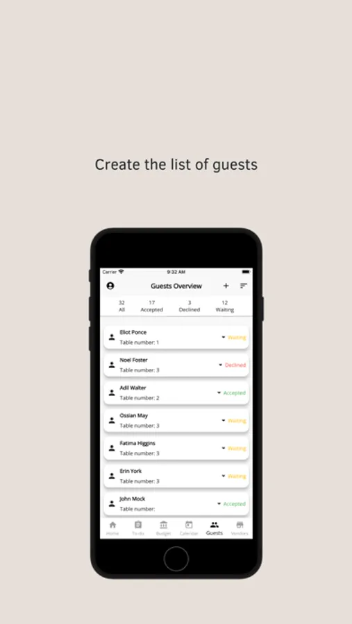 - Guests list. Create the list of guests and select a status: pending, declined, or accepted. Check the overview of the total number of guests and plan other steps accordingly.