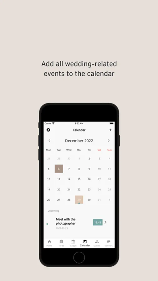 - Events Calendar. Meeting with the photographer, or is it time to pick up the invitations? Plan all the meetings and add them to the calendar.
