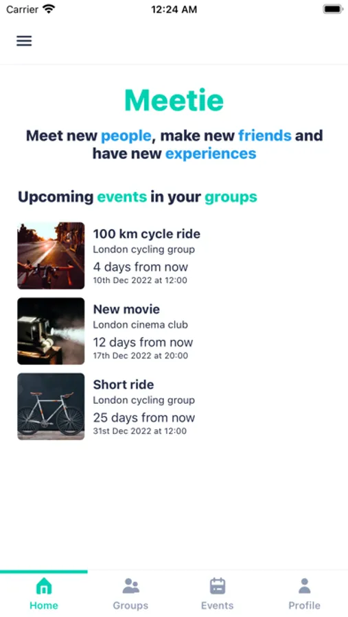 Meetie is an app where you can create groups and events related to your interests and meet new people, make new friends and have new experiences.