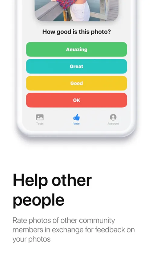 Have fun rating photos and helping others. Give ratings, earn votes, and use your votes to test your pictures. You can also buy votes to test your photos even faster