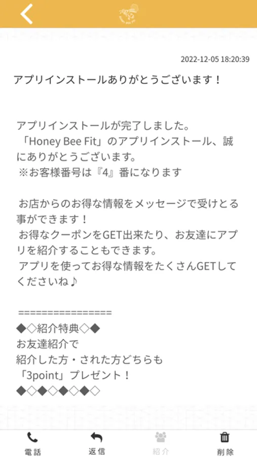 このアプリでは、HoneyBeeFitの最新情報の受け取りや便利な機能を使う事ができます。