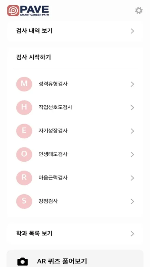 PAVE 어플은 진로와 관련된 6가지 검사와 200개 이상의 학과 정보를 알아볼 수 있는 커리어패스 어플입니다. 학과 카드를 구매하셔서 함께 이용하시면 AR 증강 퀴즈까지 풀어보실 수 있으니 자세한 사항은 어플 내 홈페이지를 참고해주세요.
