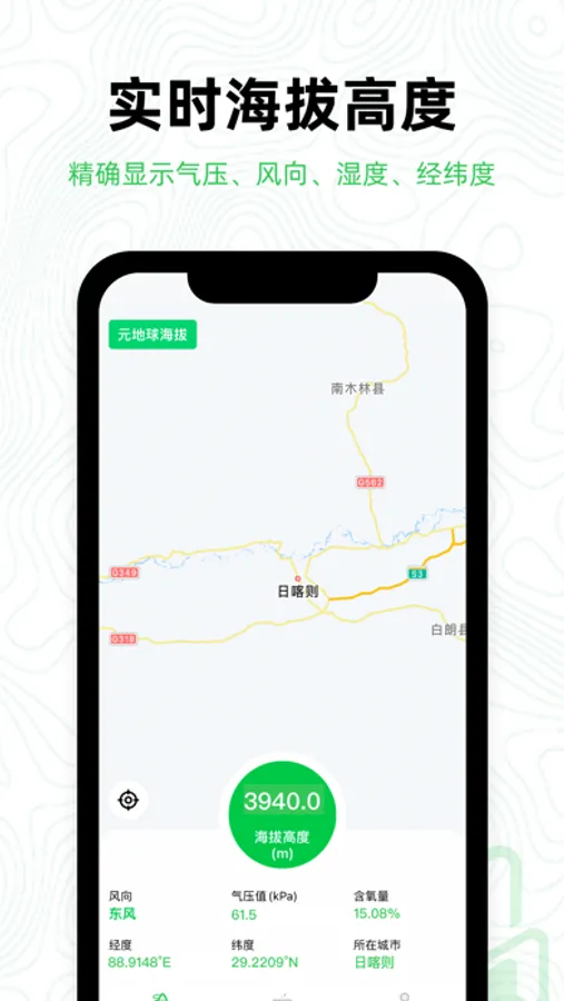 1.测海拔:通过手机GPS工具或传感器测量位置、海拔、经纬度(无网也能测)更有气压,含氧量,气压值,风向等天气数据。