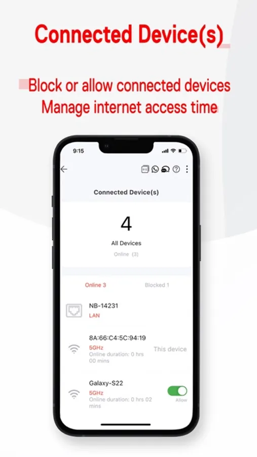 Check the connection status of connected devices, block unknown devices, and manage your child’s internet access time