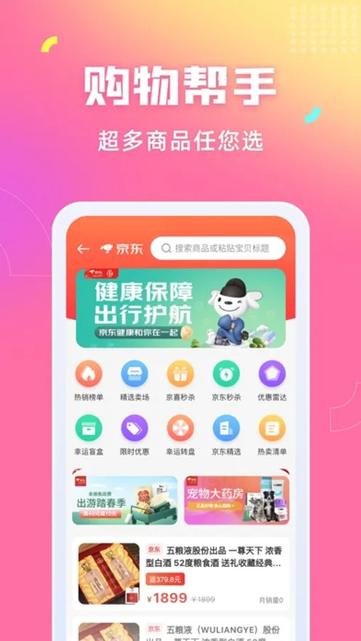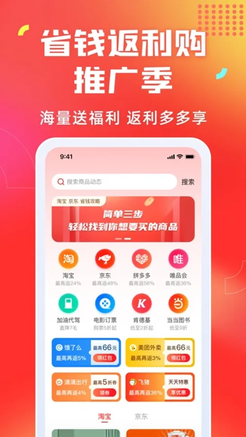 拥有省钱返利购,线上线下,衣食住行吃喝玩乐,随时随地轻松购物。