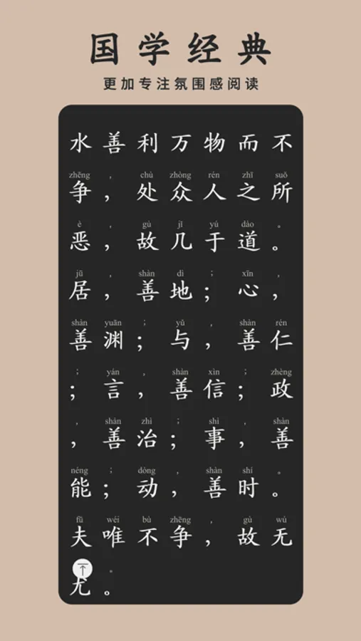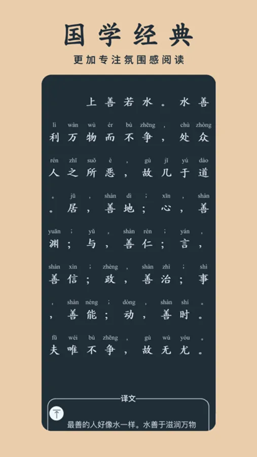 道德经品鉴,沉浸式学习和鉴赏体验。提高自身文化修养,大有裨益。全程无广告,使您全身心投入"道"的海洋。