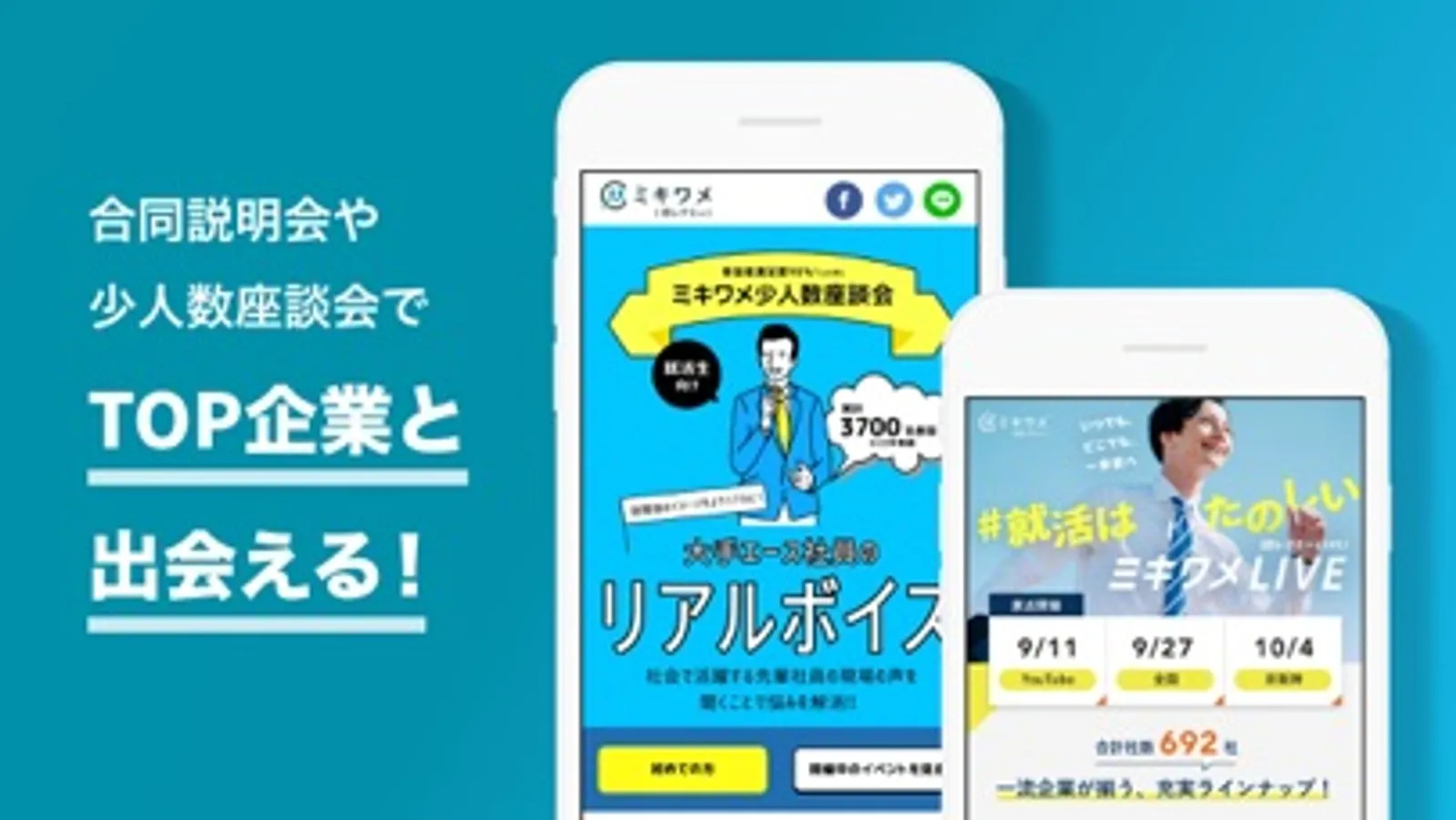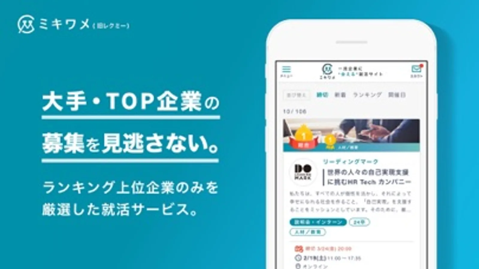 ・大手・Top企業だけが参加する日本最大級のオンライン合同企業説明会「ミキワメLIVE」や、OBOG社員とカジュアルに話せる「ミキワメ少人数座談会」を開催!先輩たちが入社する大手・Top企業を一気に知れる!