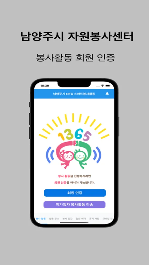 사용할때에는 스마트폰의 NFC 기능이 작동한 상태에서 스마트봉사활동앱을 작동을 시키고