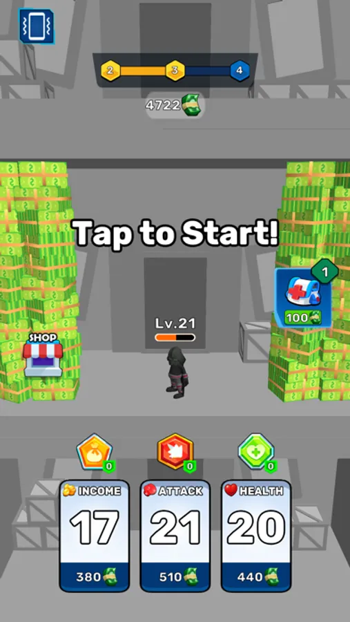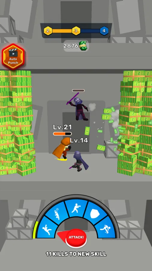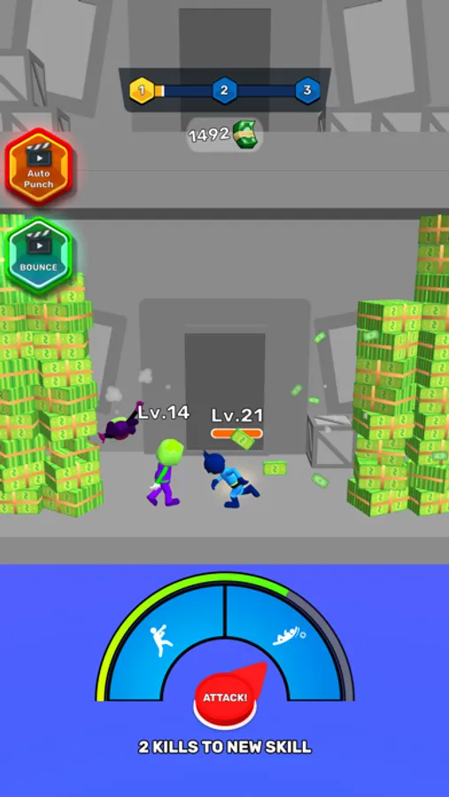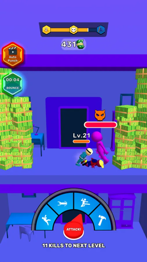 Make the thugs bounce around to gain money! Kick, punch and knock them out with fun weapons! Climb the floors as you progress and take on more powerful enemies. Reach the last floor to KNOCK OUT their BOSS! Customize your character and the enemies with funny skins to live out your cinematic fighting experience.