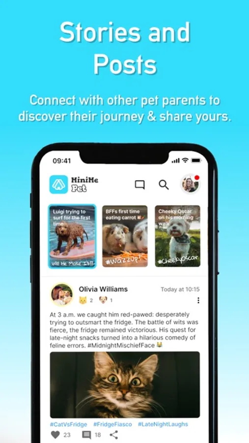 Share your pet's life with friends and followers, connect with other pets of your liking, and follow their journey with our Social Feed for Pets. Express your emotions through reactions and comments and connect with pet owners who understand how important your furry friend is to you.