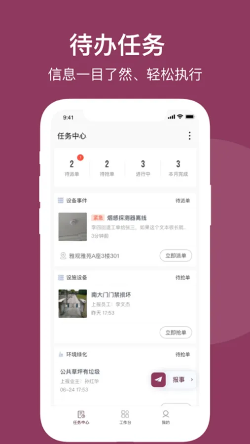 紫元服务是紫元物业管理综合服务移动平台。通过智慧化手段推进物业服务企业更好地为小区居民服务,更便捷地落实物业巡查、信息上报等管理要求。使物业信息更加透明公开,物业服务更加优质规范,居民诉求处置更加迅捷高效。其功能包括,基础数据查看、设备巡检、设备保养、报修管理、巡更管理等。