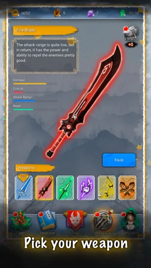 - Weapons: there are 6 types of weapons for you to choose and upgrade