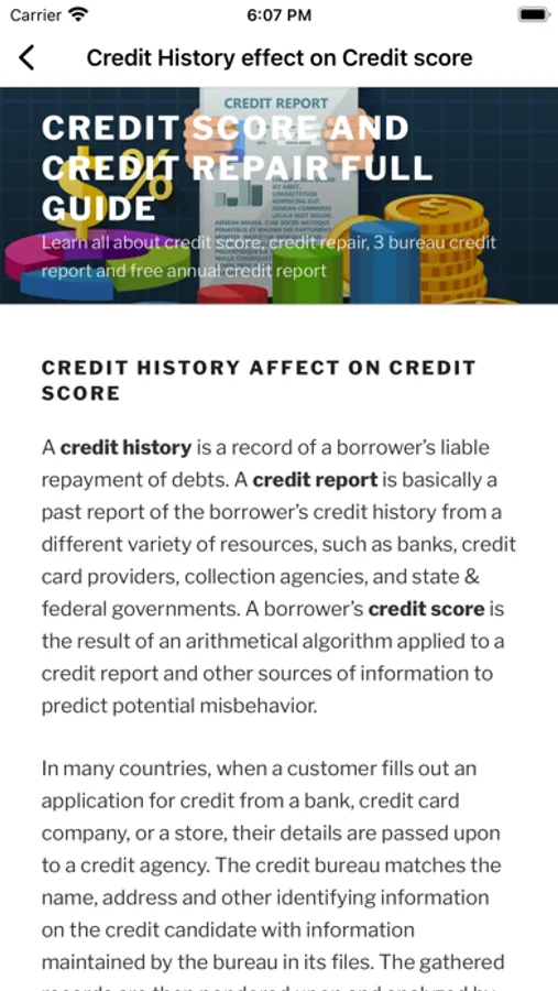 - Credit History effect on Credit score - A credit history is a record of a borrower’s liable repayment of debts. A credit report is basically a past report of the borrower’s credit history from a different variety of resources, such as banks, credit card providers, collection agencies, and state & federal governments. A borrower’s credit score is the result of an arithmetical algorithm applied to a credit report and other sources of information to predict potential misbehavior.
