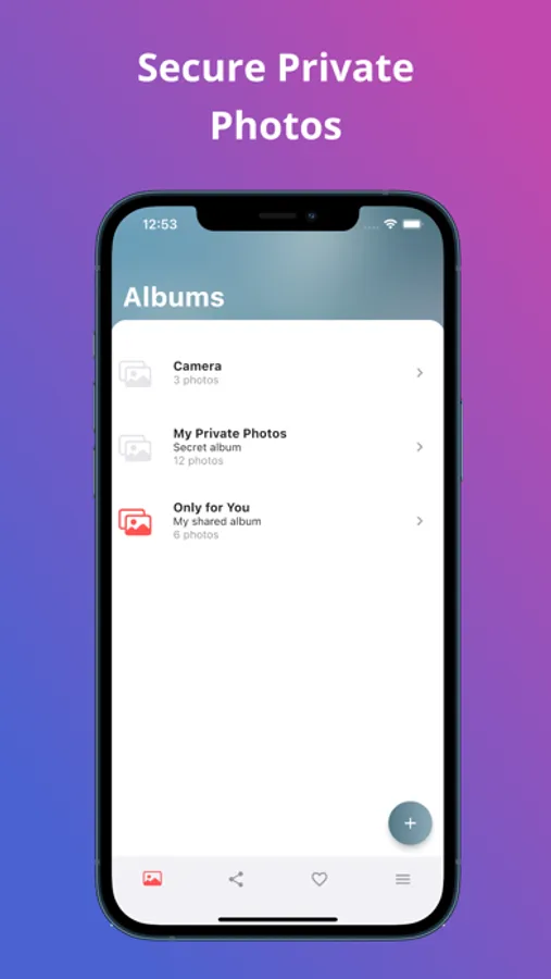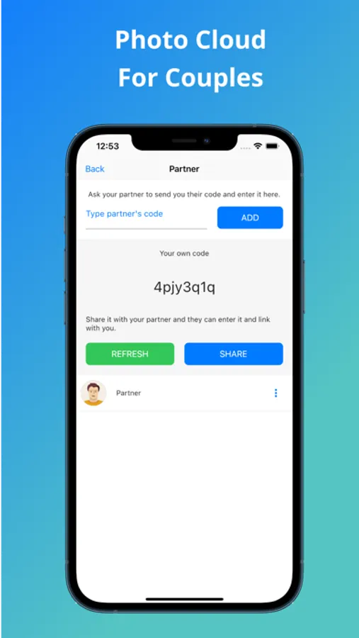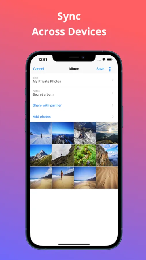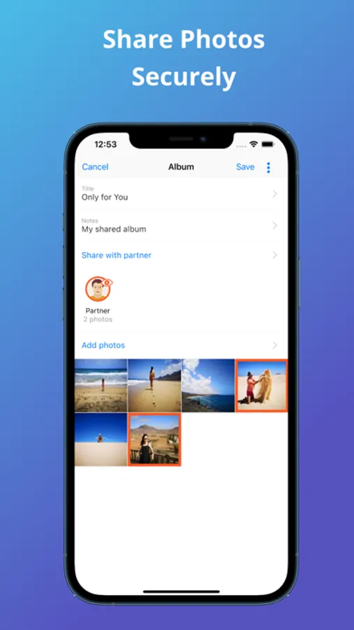 • Share full Album or selected photos or videos with your partner in a secure way.