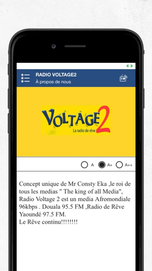Concept unique de Mr Consty Eka ,le roi de tous les medias " The king of all Media", Radio Voltage 2 est un media Afromondiale 96kbps . Douala 95.5 FM ,Radio de Rêve Yaoundé 97.5 FM.