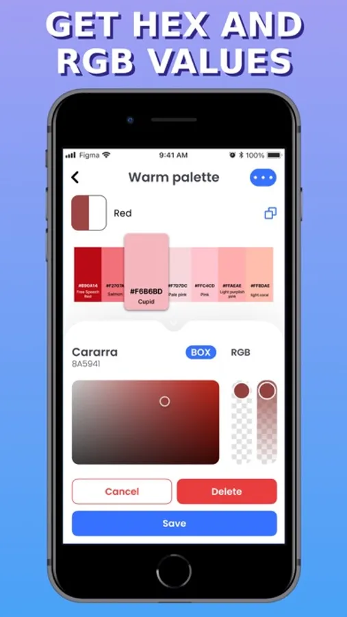 Color Picker by Image: HEX, RGB is an application that allows you to easily select and customize colors with the use of advanced color selection tools and a color wheel. With the ability to name colors, generate color palettes in hex, and rgb, and find specific shades with a color picker, this application is perfect for designers, painters, and anyone else who needs to work with colors. One of the key features is its ultra-accurate magnifier, which allows you to pick colors from anywhere on your screen with ease. Whether you are working on a graphic design project or need to find the perfect color mixing in painting, this tool makes it easy to select the exact shade and gradient you need. In addition to the magnifier, the application also allows you to use your device's camera to pick colors from real-world objects. This feature is perfect for capturing the color of a flower, piece of fabric, or any other object you want to replicate in your work.