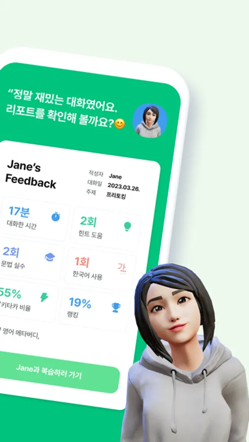 메타버디는 당신의 영어 공부를 위한 친구입니다. 메타버디 Jane과 대화를 하면서, 매일 설정한 목표량에 맞춰 영어 회화 능력을 개선할 수 있습니다. 대화 주제는 사전에 준비된 것을 사용할 수 있으며, 앱에서 제공하는 "대화 시작하기" 버튼을 클릭하면 대화를 시작할 수 있습니다.