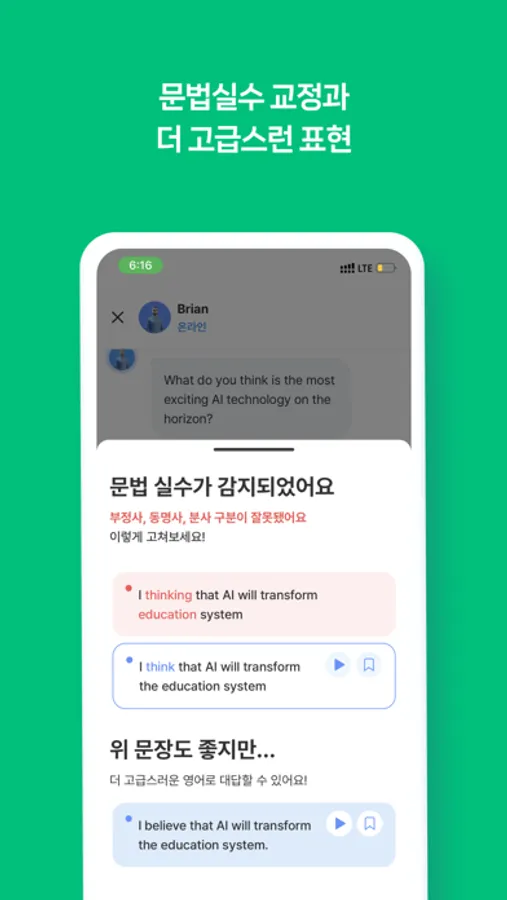 메타버디는 영어 표현 능력을 개선하는 것에 중점을 둡니다. 학습자가 말한 내용을 듣고, 문맥에 맞는 영어 표현을 제안해줍니다. 더 나아가, 문법이나 어색한 표현을 바로 잡아주며, 학습자가 학습한 내용을 기억하기 쉽도록 반복해주는 기능도 제공합니다.