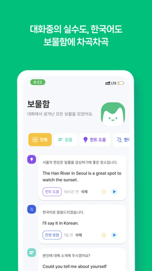 처음 오픈하면 나만의 AI 친구들과의 대화 버튼이 나오며, 나에게 하루에 맞는 대화 시간을 설정할 수 있습니다. 메타버디는 학습자가 한국어와 영어를 혼용하는 경우, 그것을 감지하고 번역해줍니다. 또한, 녹음 버튼을 한 번 클릭하면 한국어로 말한 내용을 번역해줍니다.