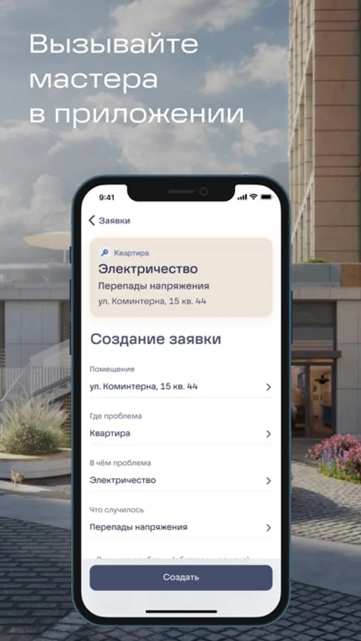 • отправлять заявки в управляющую компанию, отслеживать статусы работ и оценивать качество исполнения;