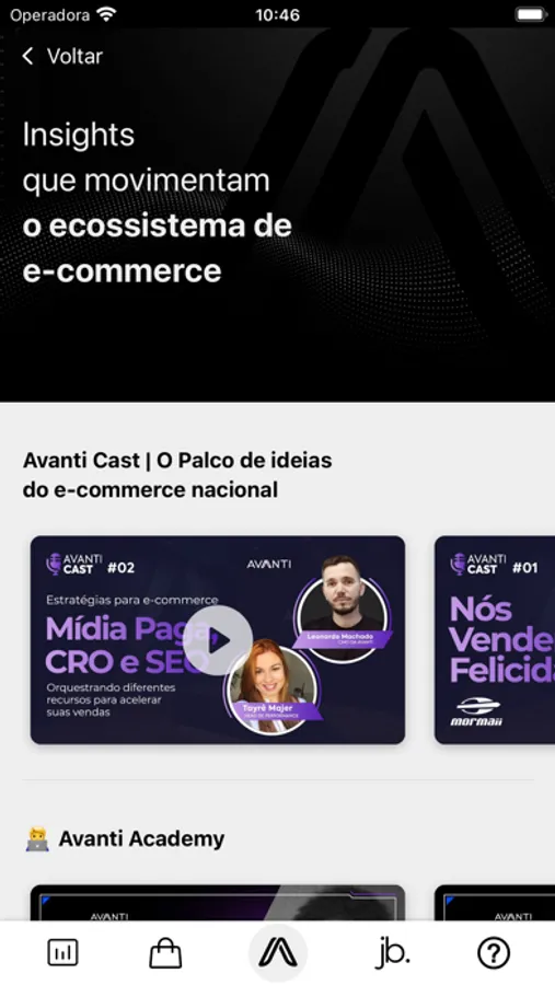 No AVANTI APP, você ainda encontra conteúdos e materiais relevantes sobre o universo do e-commerce, integrados a blogposts, podcasts, vídeos, tutoriais e muito mais! O APP também serve como um canal de comunicação direto com o Suporte Certificado VTEX, da AVANTI, oferecendo um suporte personalizado em front-end, rápido e especializado.