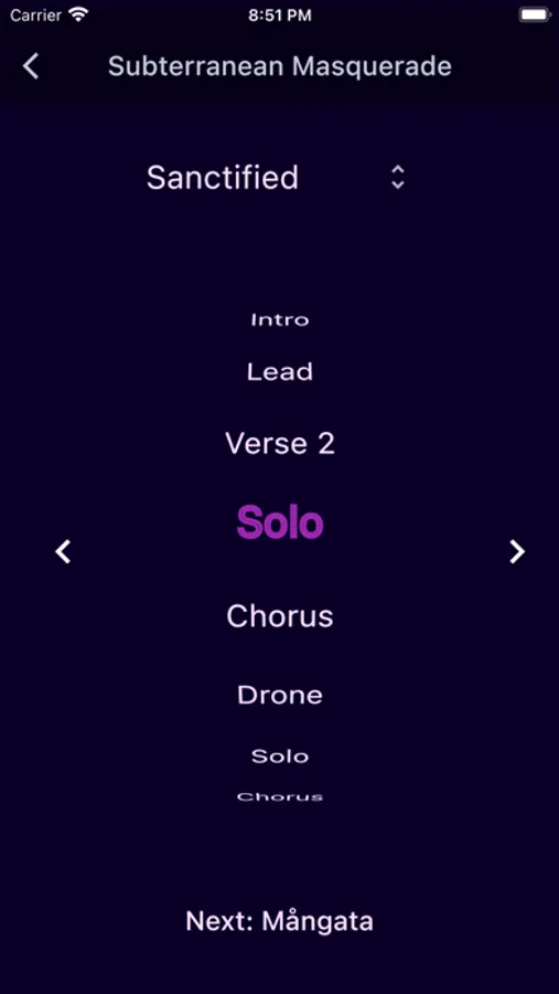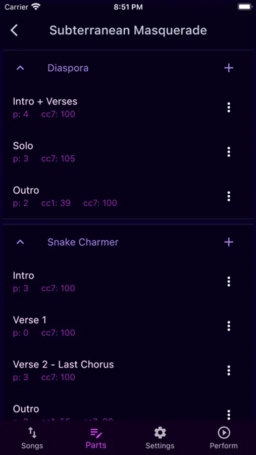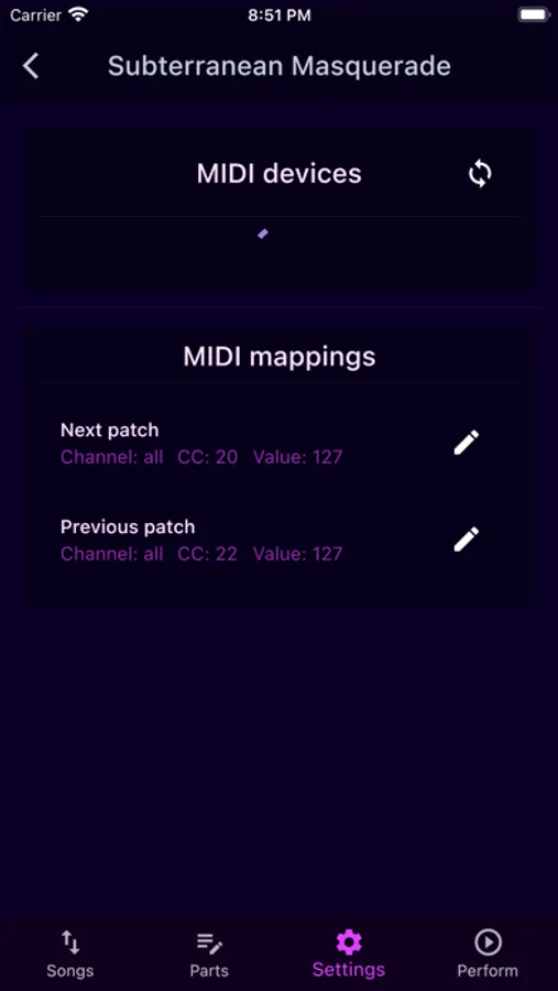 Using this app, you can create lists of songs, where parts of the song (such as verse, chorus, etc) transmit MIDI program change messages and other control parameters to your external MIDI gear. Use a page turner pedal or map any MIDI message to the 'next patch' / 'previous patch' buttons, and scroll through your patches when you perform your song without taking your hands off your guitar or keyboard.