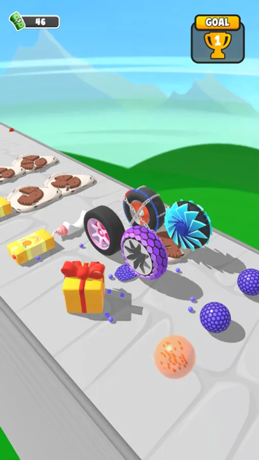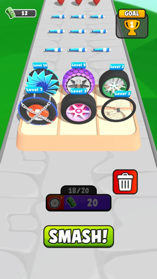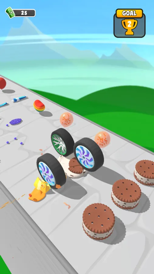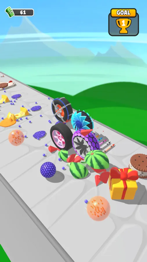 Power up by merging wheels to crush more objects!
