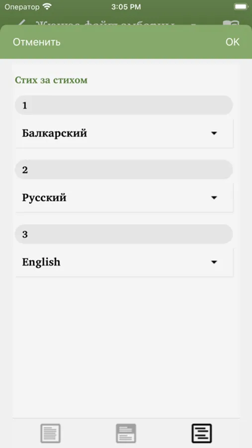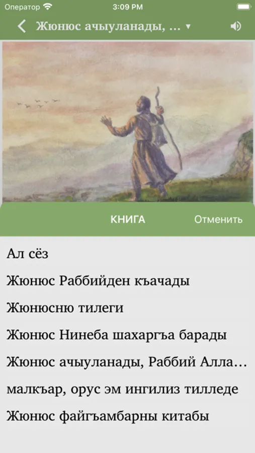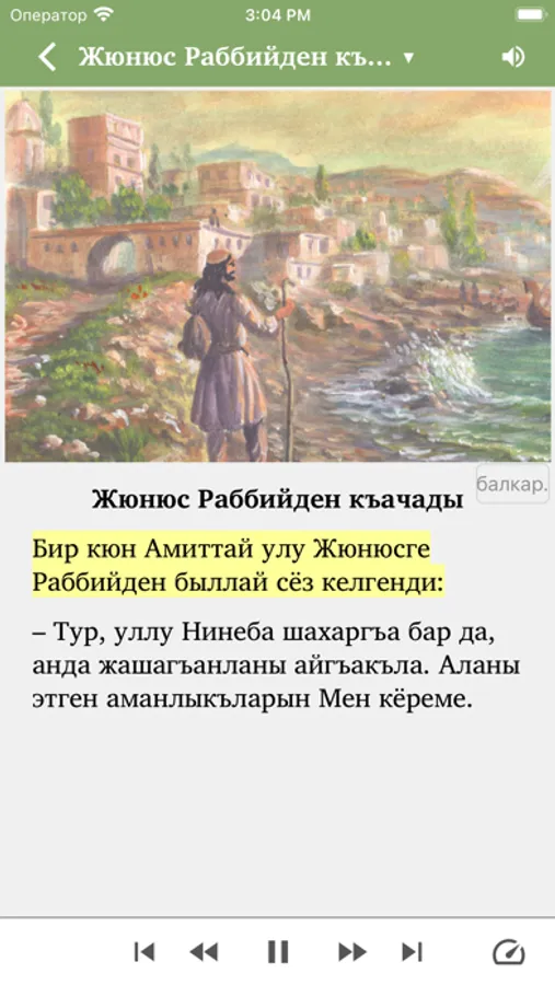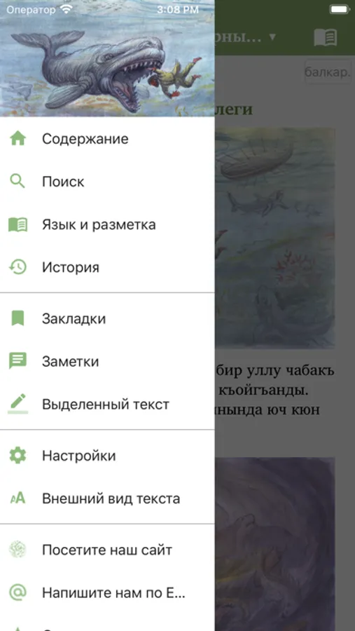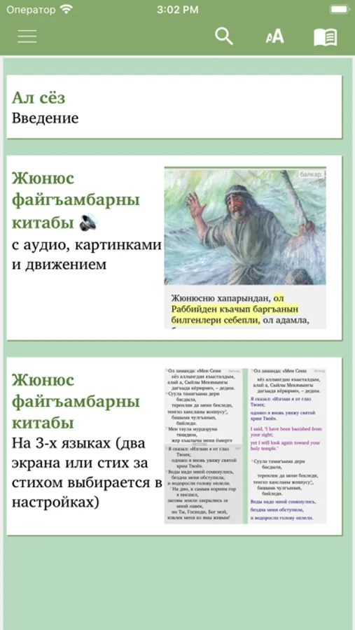 The first part of the app includes audio that has been synchronized with the text (each verse of text is highlighted when the corresponding audio fragment is played, if this option is not turned off in the app's settings). An internet connection is needed for streaming audio. The second part includes Russian and English translations that can be added to the Balkar text in parallel or verse by verse mode.