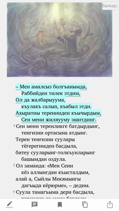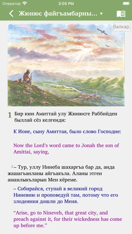 This Scripture app facilitates Bible study in the Balkar language. Users can highlight verses in different colors, make bookmarks, write notes and view their reading history.