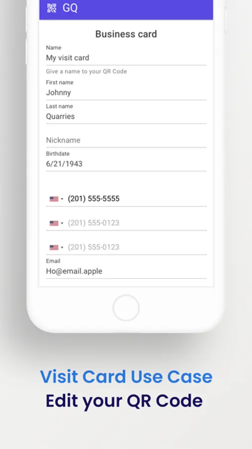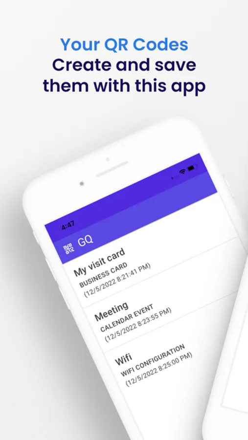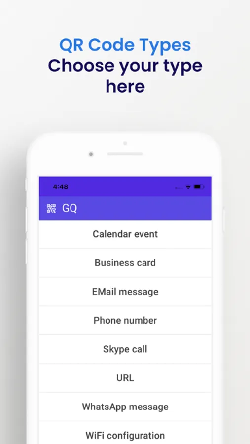 You can generate and save QR codes of different kinds: calendar event, visit card, email, phone number, URL, WhatsApp, Skype, WiFi configuration and raw text.