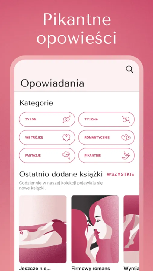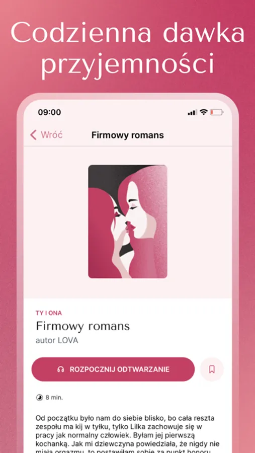 W LOVA: Opowiadania Erotyczne, znajdziesz zmysłowe historie w sześciu kategoriach: Ty i On, Ty i Ona, We trójkę, Romantycznie, Fantazje, Pikantnie. Wszystko po to, byś mogła całkowicie spełnić i zaspokoić swoje pragnienia, słuchając wyłącznie tego, na co masz ochotę. Aplikacja LOVA to nie tylko wciągające audio-erotyki, które stymulują i roznamiętniają. To Twoja bezpieczna, intymna przestrzeń, w której możesz eksperymentować, eksplorować nieznane dotąd emocje, doznania, pasje oraz pogłębiać fantazje.