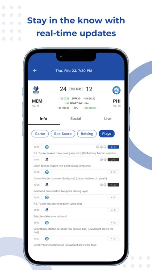 - Browse through real-time NBA scores, stats, news, and betting odds. Never miss what's happening with your favorite teams, players, and match-ups