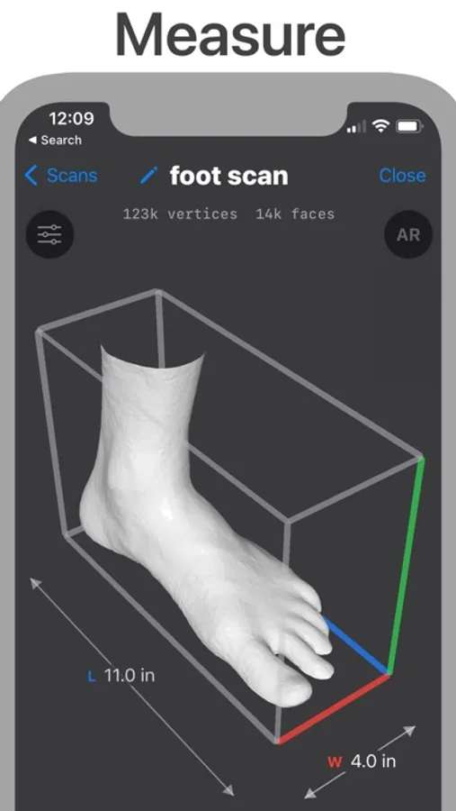 Take any measurements such as length or width, arch height etc. Share your 3d model using iMessage, or export to lots of common 3d formats.