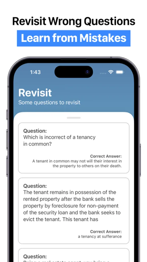 - Revisit Questions feature shows you a list of questions that you've answered incorrectly, so you could learn and memorize them