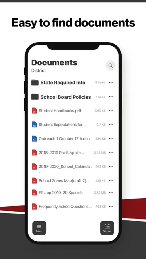 The event section shows a list of events throughout the district. Users can add an event to their calendar to share the event with friends and family with one tap.