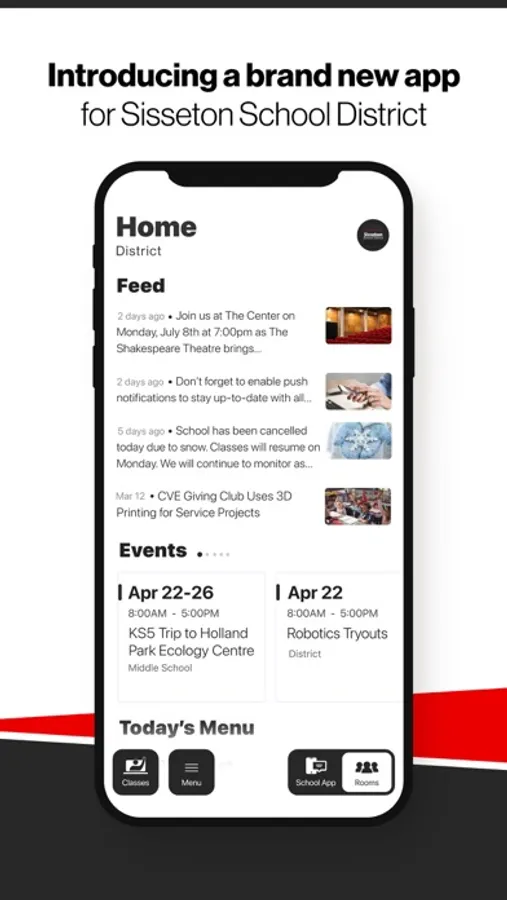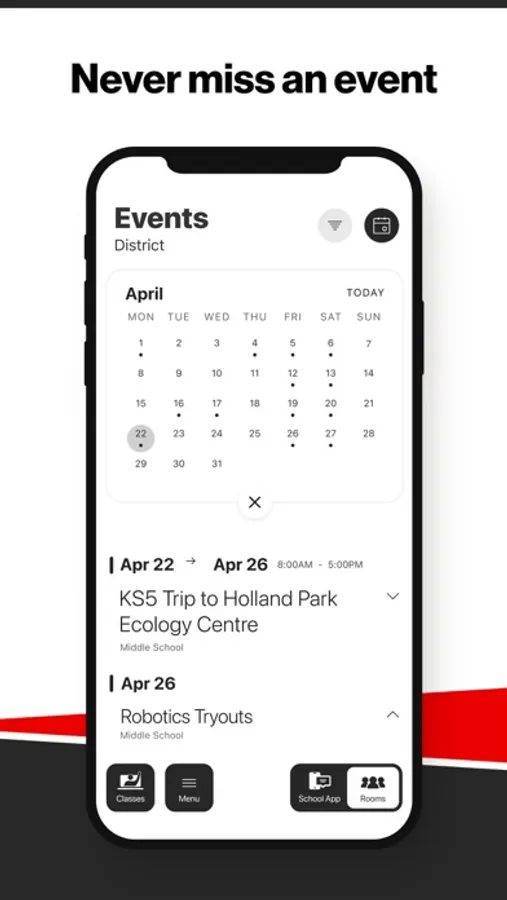 The event section shows a list of events throughout the district. Users can add an event to their calendar to share the event with friends and family with one tap.