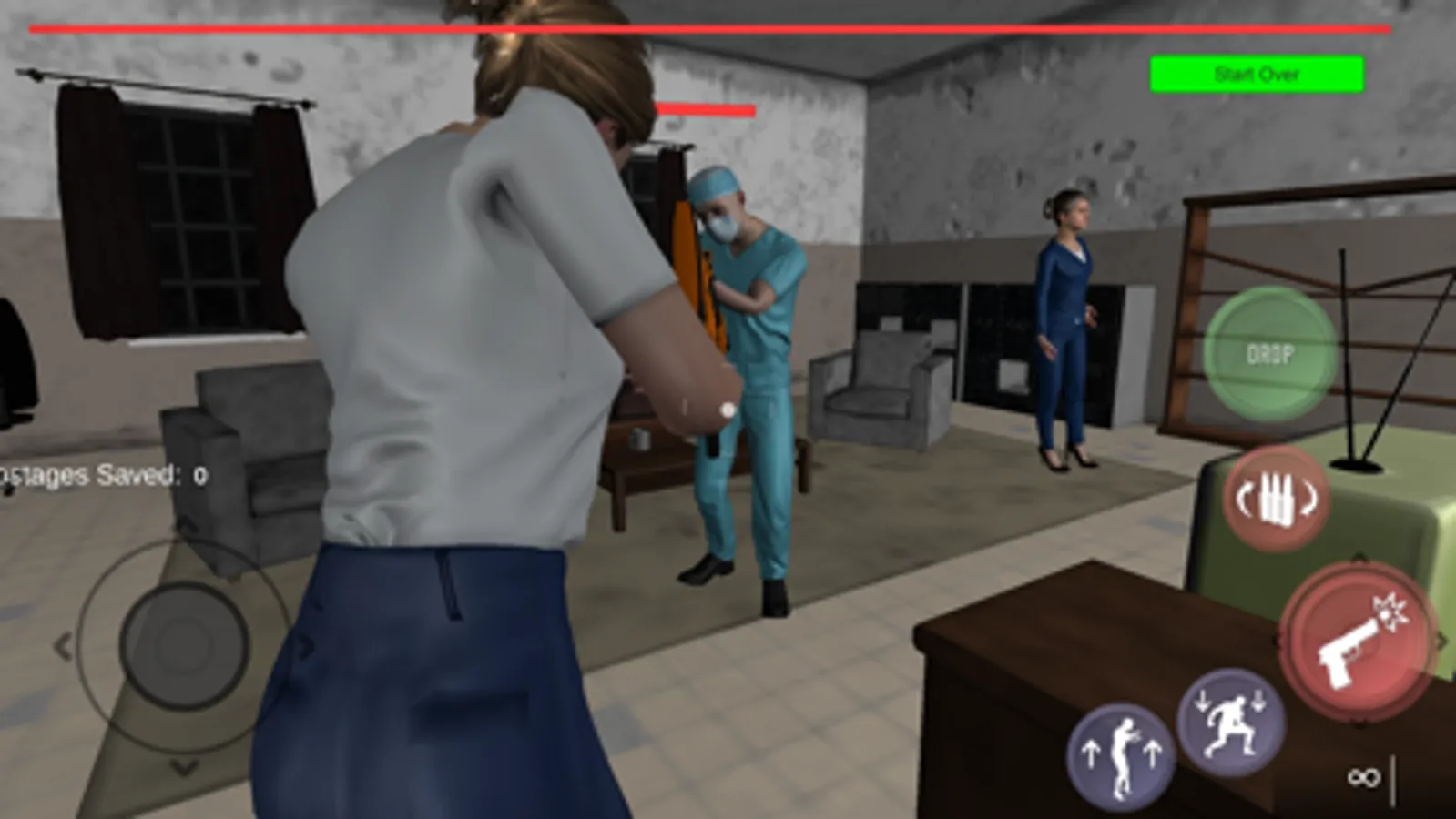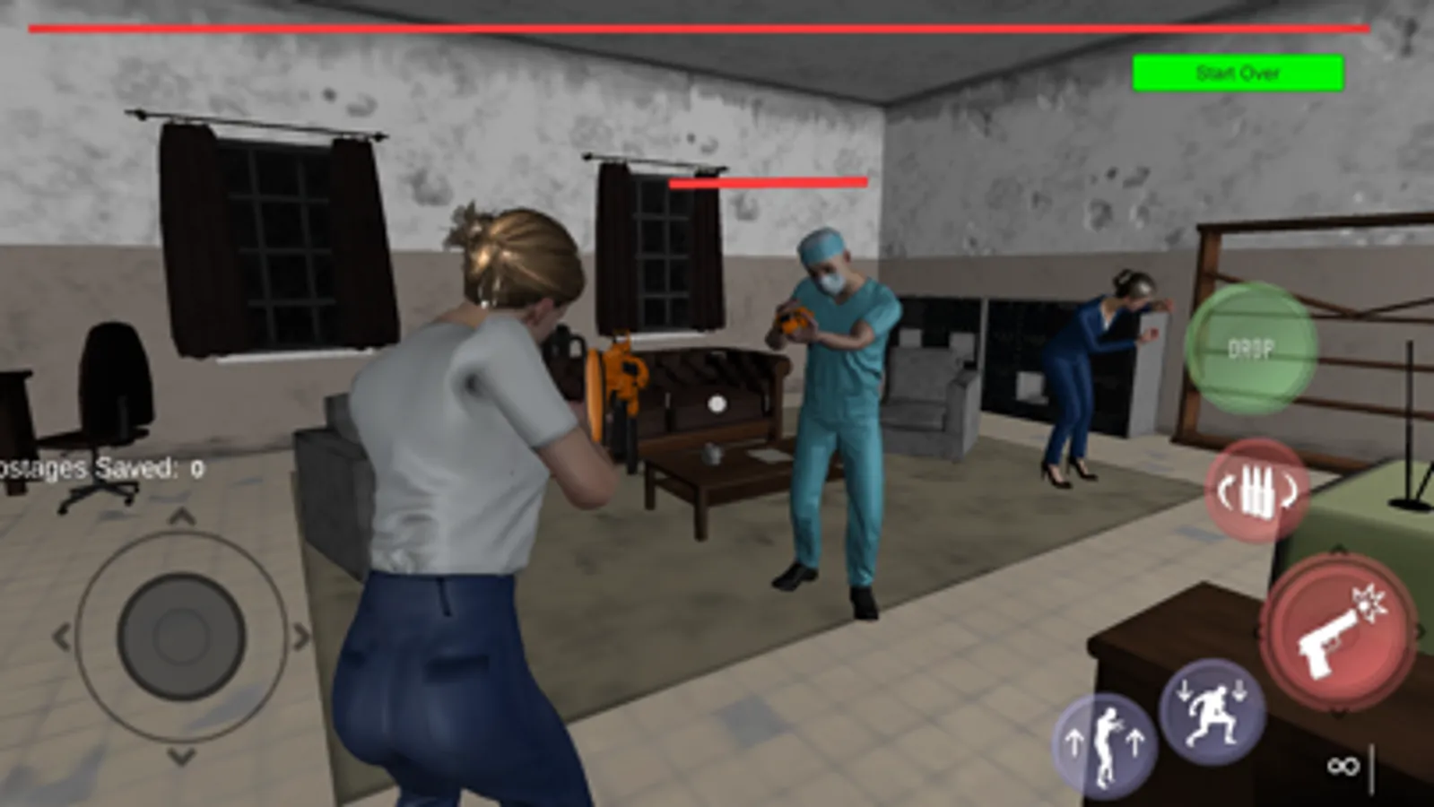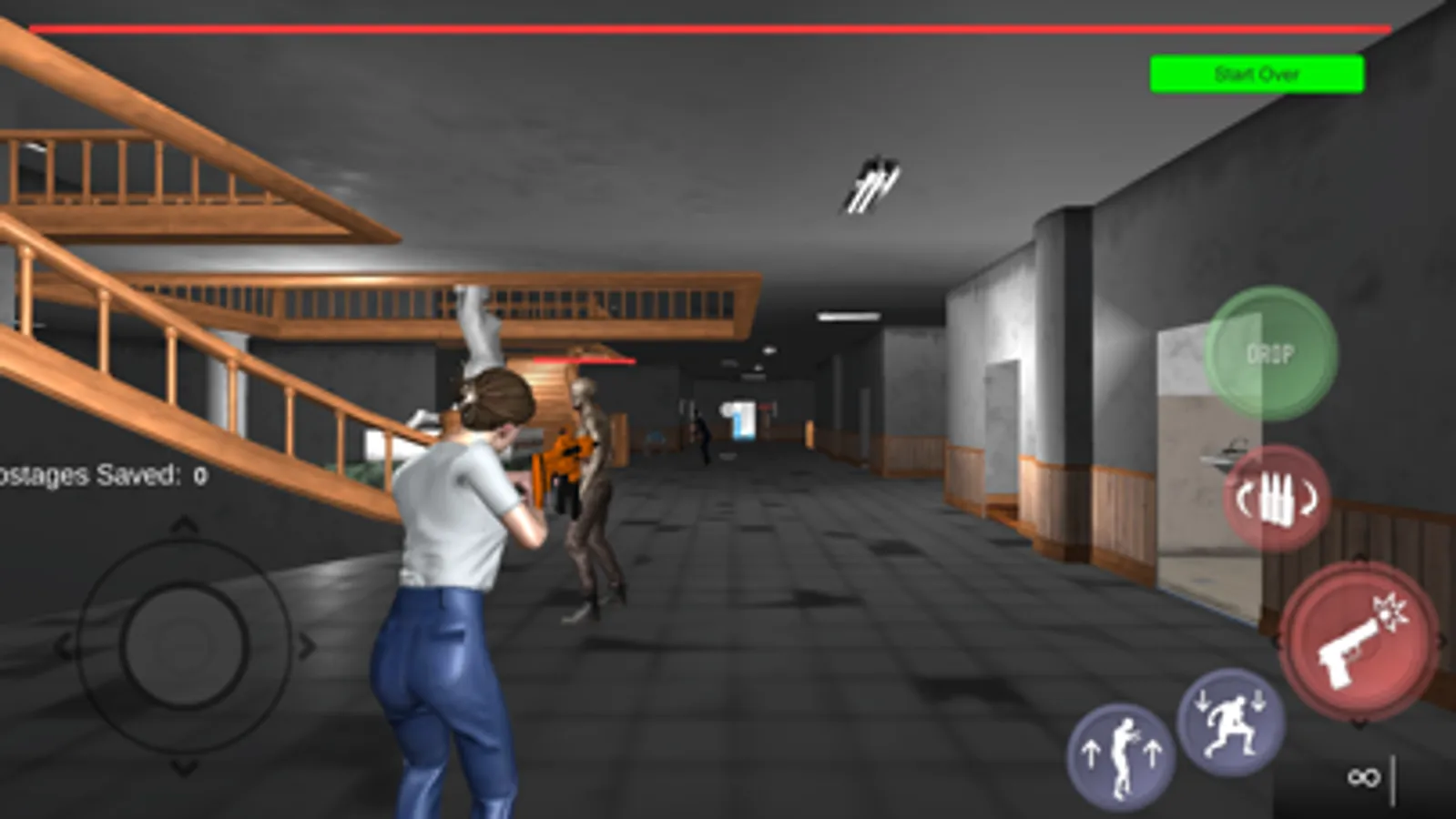 A deadly virus has been released inside of an insane asylum and has turned half of the patients and staff into zombies. The other half need rescuing. Armed with a rifle and unlimited bullets, your job, in this shoot em up zombie game, is to blast your through the hospital and save 20 hostages.