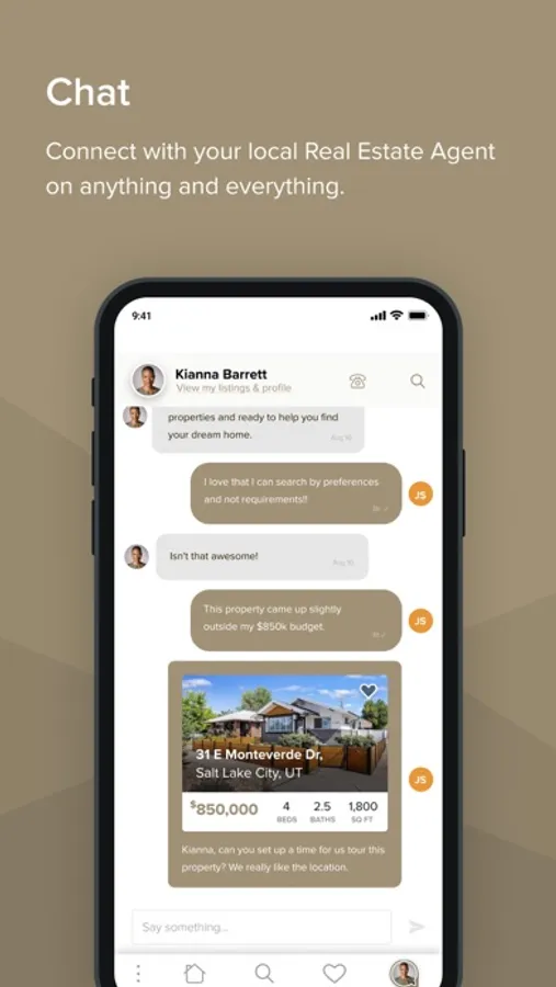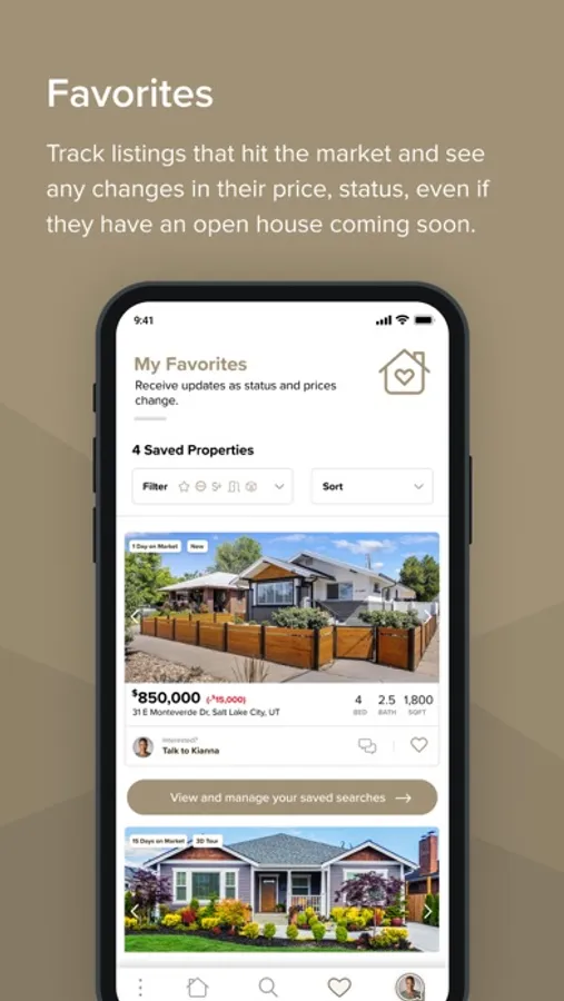 My Favorites: View saved searches and suggested homes with ease and connect with your agent for any questions.