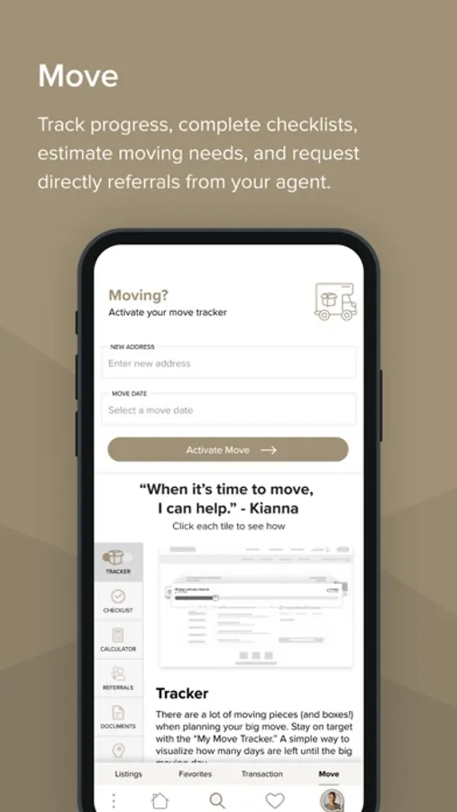 My Move: View move progress, estimate moving needs, complete checklists, and receive service referrals or second opinions from your agent.