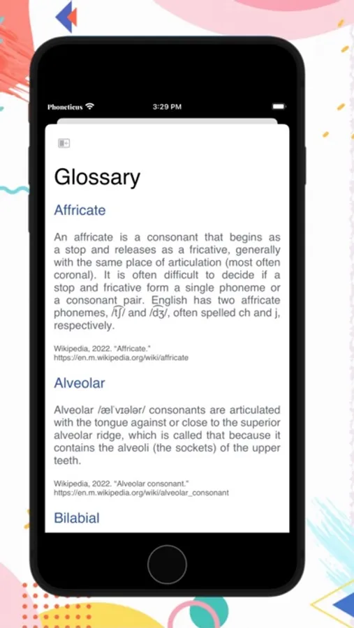 All definitions provided on this app are from Wikipedia. Each definition is accompanied by a link to the relevant Wiki entry to deepen your knowledge of English phonetics.