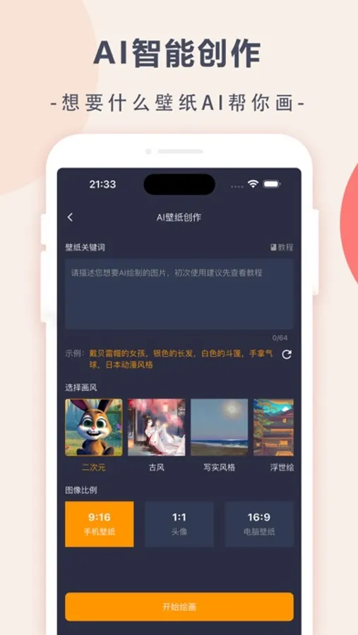 6. 提供AI创作功能,让AI按照你的意图画出独一无二的的壁纸,壁纸从此不再“撞衫”
