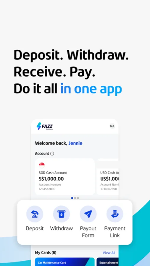 With Fazz Business, you can easily view your account balances and details, track transactions, manage corporate cards, create transfers and payment links – all from the convenience of your mobile device.