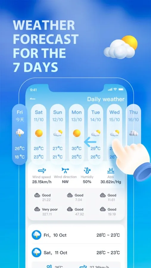 - Weather App provides accurate detailed weather forecasts for the next 7 days.
