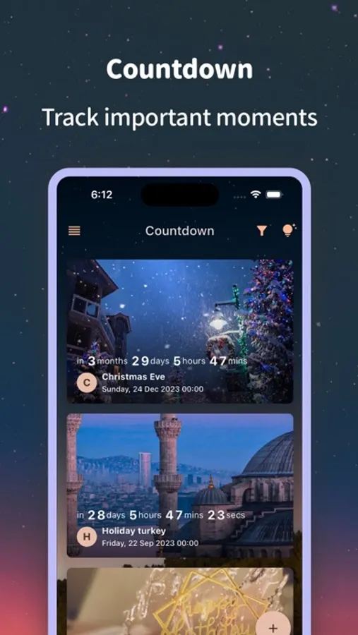 Countdown Timer & Widget is a powerful tool that helps you stay organized and on top of your upcoming events. With its recurring countdowns, multiple categories, and a variety of exquisite backgrounds, It is the perfect way to count down to birthdays, holidays, weddings, anniversaries, and more.